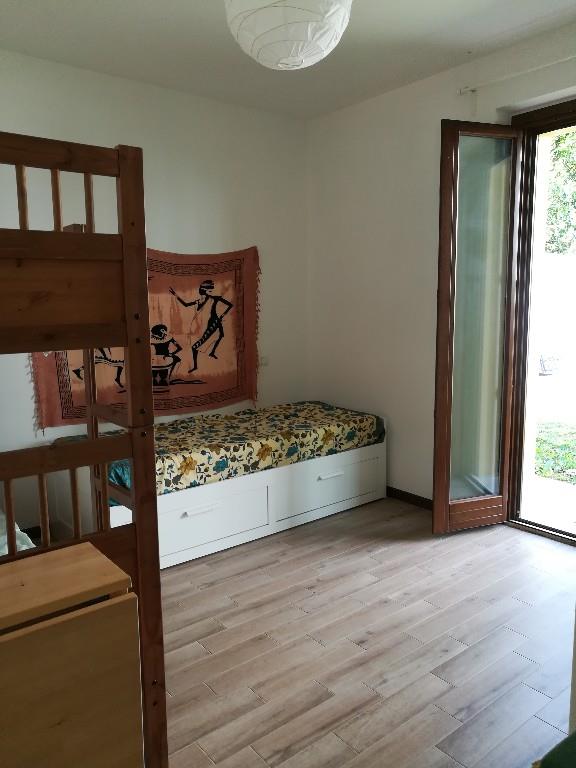 Da Privato. Appartamento con ingresso indipendente, no condominio, al piano terra di una palazzina di 4 appartamenti, ben rifinita di recente costruzione, abitata da persone residenti, in zona con tutti i servizi, vicina al centro, a 450 metri dal mare ma molto tranquilla. Ampio salone con angolo cottura, camera matrimoniale, cameretta, bagno e ripostiglio. Giardino e terrazzo sia davanti che sul retro della casa. L'appartamento è praticamente nuovo, molto luminoso e con doppia esposizione. Riscaldamento a pavimento. Completano la proprietà un posto auto privato e la cantina