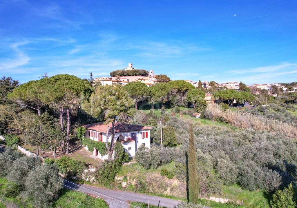 Villa con giardino privato e vista panoramica fino al mare a pochi passi dal centro storico di Montescudaio. Si tratta di una villa indipendente situata nelle primissime campagne del suggestivo borgo medievale di Montescudaio, a breve distanza dal centro del paese e dai principali servizi. Circondata da un incantevole giardino privato di circa 500 mq, che offre una vista panoramica mozzafiato sulle circostanti campagne fino al mare. L'accesso all'abitazione, di circa 210 mq, avviene tramite un'ampia terrazza panoramica d’entrata dove un luminoso ingresso introduce a varie aree funzionali: un accogliente soggiorno, uno studio, un salotto, una sala da pranzo caratterizzata da un camino e con accesso ad una terrazza esterna, e un cucinotto; un corridoio lungo e luminoso conduce alla zona notte, composta da due camere matrimoniali, una camera singola con terrazzo privato e bagno annesso, una spaziosa camera con accesso diretto al giardino ed un bagno finestrato con vasca. Una scala a chiocciola posta nell'ingresso consente di raggiungere il livello seminterrato, accessibile anche dal giardino. Qui sono presenti vari locali adibiti a sgombero, oltre a un bagno da rinnovare ed un garage, offrendo spazio aggiuntivo e molteplici possibilità di utilizzo per una superficie totale di circa 110mq. In sintesi, questa proprietà rappresenta un'opportunità unica per vivere in un ambiente tranquillo e suggestivo, con ampi spazi interni ed esterni e una vista panoramica che abbraccia la bellezza delle campagne toscane fino al mare. Montescudaio è un incantevole borgo medievale situato nelle colline della Toscana, caratterizzato da stretti vicoli lastricati e affascinanti palazzi storici. Circondato da paesaggi mozzafiato di uliveti, vigneti e boschi di lecci, offre un'atmosfera tranquilla e autentica. Nel centro del paese si trovano negozi, ristoranti e caffè che offrono prodotti locali ed cucina tipica toscana. La sua posizione strategica permette di godere della vicinanza al mare, con le splendide spiagge della costa tos